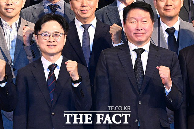 [더팩트ㅣ남용희 기자] 김정관 산업통상자원부 장관과 최태원 대한상공회의소 회장(앞줄 왼쪽 여섯 번째부터) 및 참석자들이 10일 오전 서울 중구 웨스틴 조선에서 열린 ‘제조 AX 얼라이언스(M.AX 얼라이언스) 출범식’에서 기념촬영을 하고 있다.
