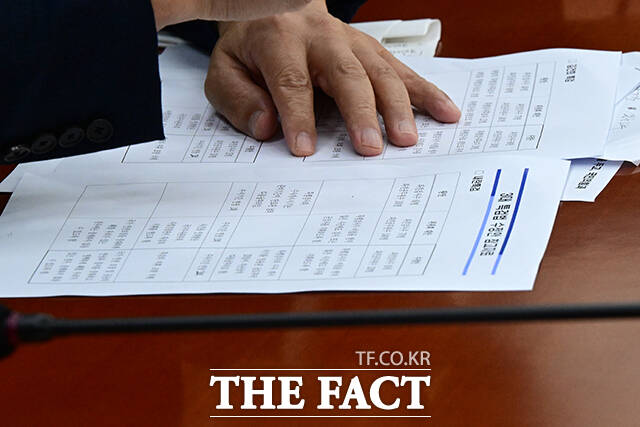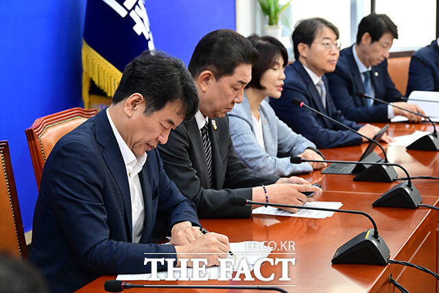[더팩트ㅣ국회=남윤호 기자] 문진석 더불어민주당 원내수석부대표가 11일 오전 서울 여의도 국회에서 열린 정책조정회의에서 김건희 특검 수정안의 파견공무원수 100명을 120으로 수정하고 있다.