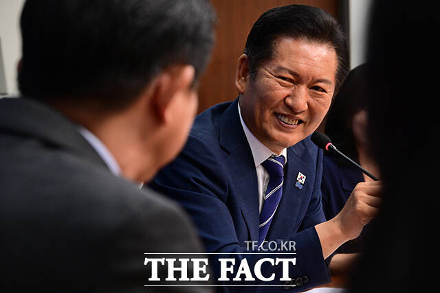 [더팩트ㅣ국회=남윤호 기자] 정청래 더불어민주당 대표가 11일 오전 서울 여의도 국회에서 다이빙 주한중국대사를 만나 미소짓고 있다.
