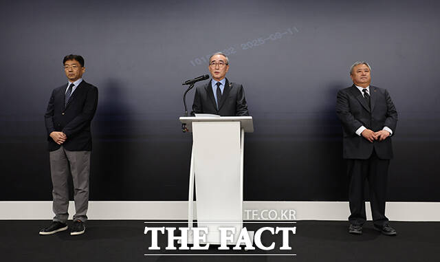 [더팩트ㅣ임영무 기자] 김영섭 KT 대표이사(가운데)가 11일 오후 서울 종로구 KT 광화문빌딩 웨스트에서 소액결제 피해와 관련해 입장을 밝히고 있다.