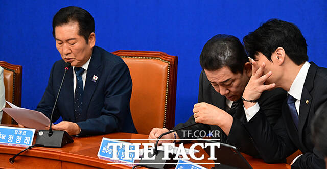 [더팩트ㅣ국회=남윤호 기자] 정청래 더불어민주당 대표가 12일 오전 서울 여의도 국회에서 열린 최고위원회의에 참석해 생각에 잠겨있다. 오른쪽은 김병기 원내대표.