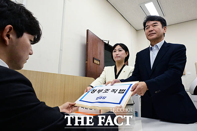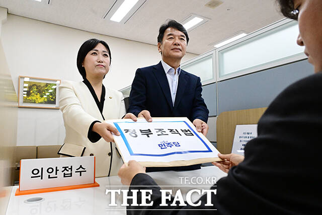 [더팩트ㅣ국회=남윤호 기자] 문진석 더불어민주당 원내수석부대표와 백승아 원내대변인이 12일 오전 서울 여의도 국회 의안과에 '정부조직법 개정안'을 제출하고 있다.