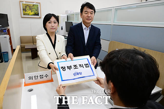 문진석 더불어민주당 원내수석부대표와 백승아 원내대변인이 12일 오전 서울 여의도 국회 의안과에 '정부조직법 개정안'을 제출하고 있다. /국회=남윤호 기자