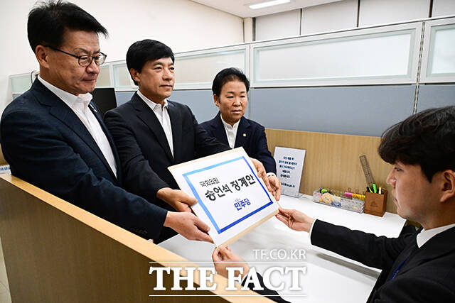 [더팩트ㅣ국회=남윤호 기자] 이성윤 더불어민주당 법률위원장, 임호선 수석사무부총장, 문정복 조직부총장이 12일 오전 서울 여의도 국회 의안과에 '국회의원 송언석 징계안'을 제출하고 있다.