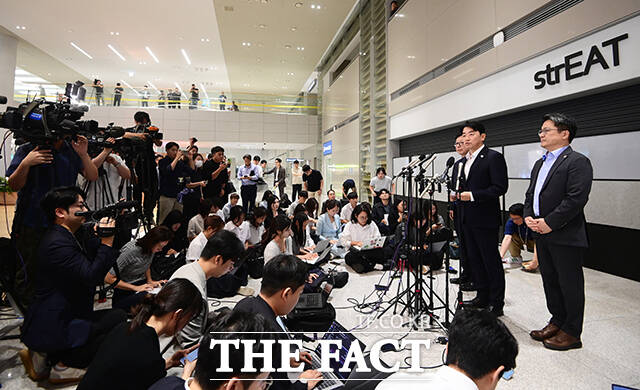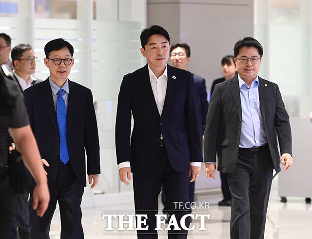 [더팩트ㅣ인천국제공항=박헌우 기자] 미국 조지아주 현대차그룹-LG에너지솔루션 배터리 합작 공장 건설 현장에서 구금됐다가 석방된 한국인 노동자들이 12일 오후 인천국제공항을 통해 귀국한 가운데 강훈식 대통령실 비서실장(가운데)이 브리핑을 하고 있다.