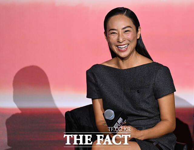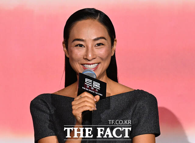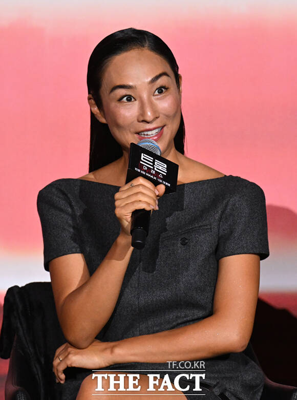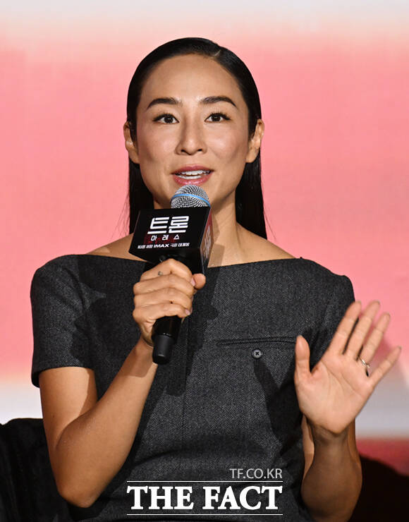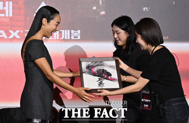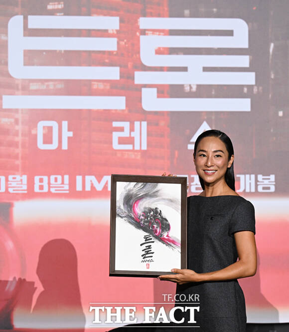 [더팩트ㅣ이새롬 기자] 배우 그레타 리가 15일 서울 용산구 CGV 용산아이파크몰에서 열린 영화 '트론: 아레스' 내한 기자간담회에 참석해 수묵화로 표현한 영화 이미지를 선물받고 있다.