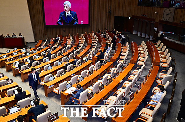 [더팩트ㅣ국회=배정한 기자] 서왕진 조국혁신당 원내대표가 15일 오후 서울 여의도 국회에서 열린 본회의에 참석해 비교섭단체 대표 발언을 하고 있는 가운데 국민의힘 의원들의 좌석이 비어있다.