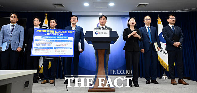 [더팩트ㅣ임영무 기자] 김영훈 고용노동부 장관(가운데)이 15일 오후 서울 종로구 정부서울청사에서 노동안전 종합대책을 발표하고 있다.