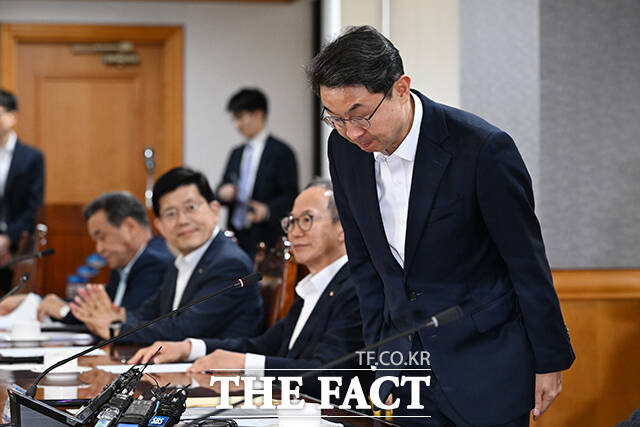 [더팩트ㅣ서예원 기자] 이억원 금융위원장이 15일 오후 서울 중구 은행연합회에서 열린 '금융위원장-금융지주 회장 간담회'에 참석해 모두 발언에 앞서 인사를 하고 있다.