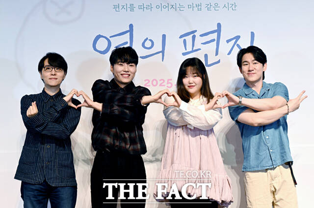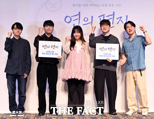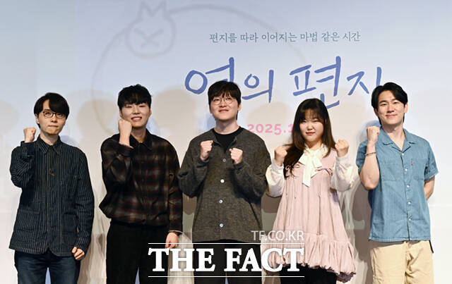 [더팩트ㅣ이새롬 기자] 성우 남도형과 김민주, 악뮤(AKMU) 이수현, 민승우(왼쪽부터)가 15일 서울 송파구 롯데시네마 월드타워점에서 열린 영화 '연의 편지' 언론시사회 및 기자간담회에 참석해 포즈를 취하고 있다.