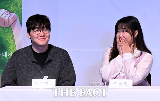악뮤(AKMU) 이수현(왼쪽 두 번째)이 15일 서울 송파구 롯데시네마 월드타워점에서 열린 영화 '연의 편지' 언론시사회 및 기자간담회에 참석해 취재진 질의에 답하고 있다.