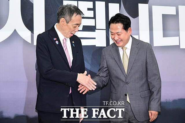 장동혁 국민의힘 대표(오른쪽)가 15일 오후 서울 여의도 국회에서 미즈시마 고이치 주한일본대사를 만나 인사말을 하고 있다. /국회=남윤호 기자