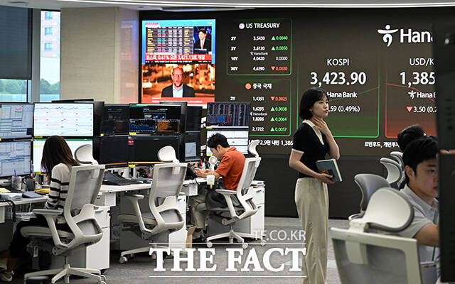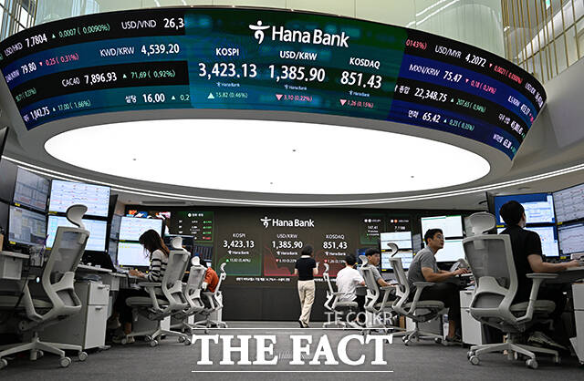 [더팩트ㅣ서예원 기자] 코스피가 5거래일 연속 최고가를 경신한 16일 오전 서울 중구 하나은행 본점 딜링룸 전광판에 코스피 지수가 나타나고 있다.