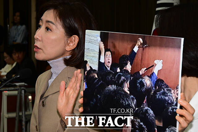 나 의원은 빠루가 찍힌 사진을 가리키며 "박찬대 의원이 이 빠루로 문을 뜯는 경호원과 민주당 관계자를 지휘하는 사건"이라며 "이렇게 폭력적으로 의회를 폭력 국회로 이들이 만들어 놓고 그다음 한 것이 프레임 씌우기"라고 주장했다.