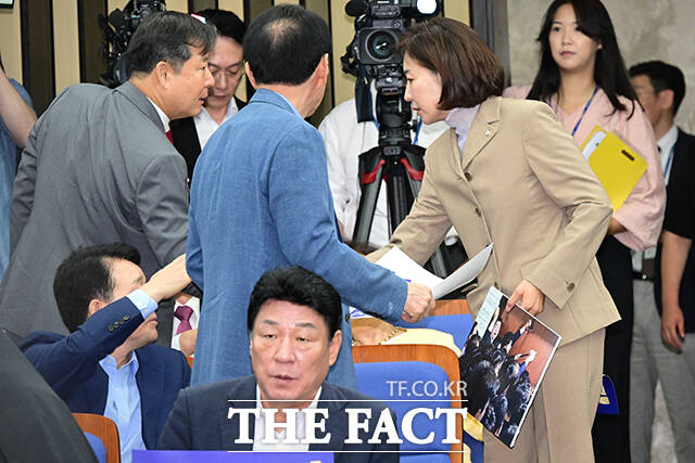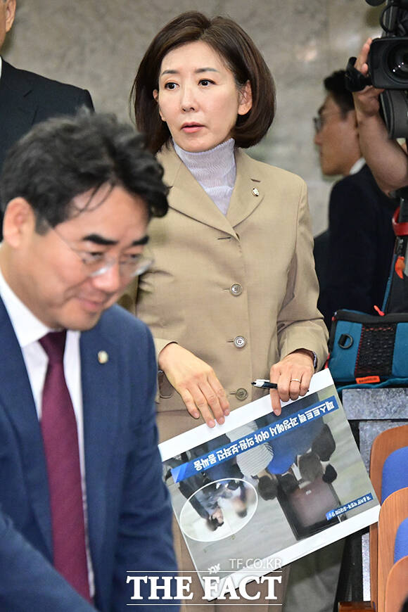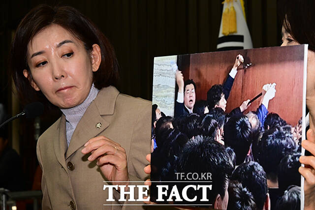[더팩트ㅣ국회=남윤호 기자] 나경원 국민의힘 의원이 16일 오전 서울 여의도 국회에서 열린 긴급 의원총회에 참석해 신상발언을 하고 있다. 사진은 패스트트랙 충돌 사건 당시 '빠루(쇠지렛대)' 사진을 바라보는 나 의원의 모습.