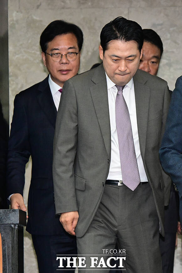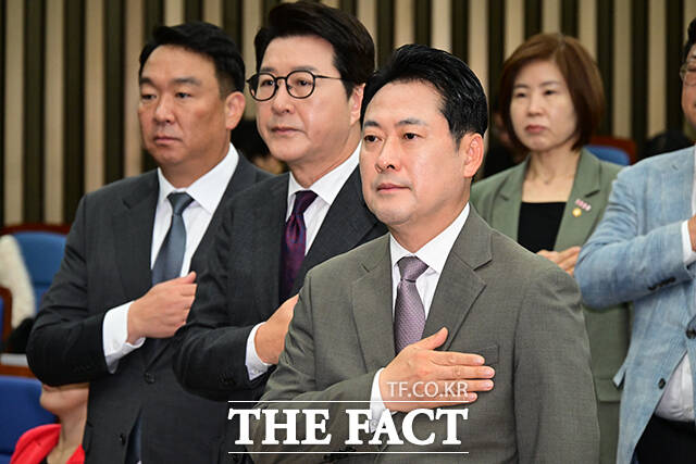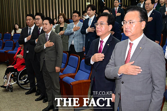 [더팩트ㅣ국회=남윤호 기자] 장동혁 국민의힘 대표(왼쪽)와 송언석 원내대표 등 의원들이 16일 오전 서울 여의도 국회에서 열린 긴급 의원총회에 참석해 규탄구호를 외치고 있다.