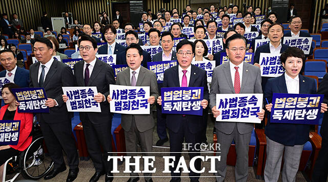 송 원내대표는 "전담재판부라고 하는 것도 헌법상 근거가 없으면 안 되는 것"이라며 "3대 특검까지 전부 전담재판부로 하겠다는 것인데 이것이야말로 사법 질서를 완전히 무시하는 발상이고 아예 헌법 위에 권력이 있다고 착각하는 것"이라고 했다.