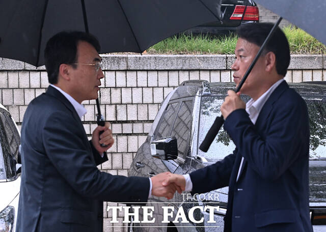 [더팩트ㅣ이새롬 기자] 통일교 측으로부터 불법 정치자금을 받은 혐의를 받는 권성동 국민의힘 의원의 구속 전 피의자 심문(영장실질심사)이 16일 오후 서울 서초구 서울중앙지방법원에서 열린 가운데, 국민의힘 의원들이 권 의원의 출석에 동행하고 있다.