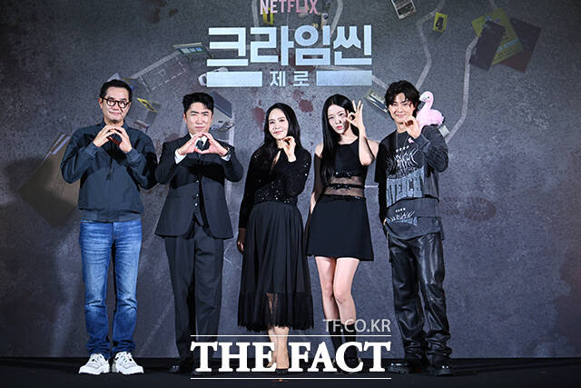 [더팩트ㅣ박헌우 기자] 영화감독 장진과 개그맨 장동민, 박지윤 아나운서, 윤현준PD, 황슬우PD, 아이브(IVE) 안유진, 배우 김지훈(왼쪽부터)이 16일 오후 서울 구로구 라마다 신도림 호텔에서 열린 넷플릭스 새 예능 '크라임씬 제로' 제작발표회에 참석해 포즈를 취하고 있다.