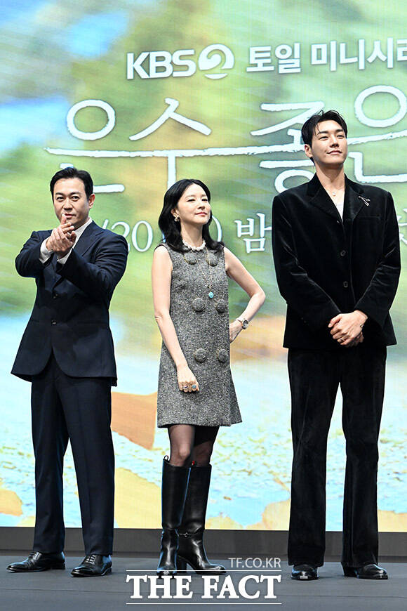 배우 박용우와 이영애, 김영광(왼쪽부터)이 16일 오후 서울 구로구 신도림 디큐브시티 더 세인트 그랜드볼룸에서 열린 KBS2 토일 미니시리즈 '은수 좋은 날' 제작발표회에 참석해 포즈를 취하고 있다. /남용희 기자