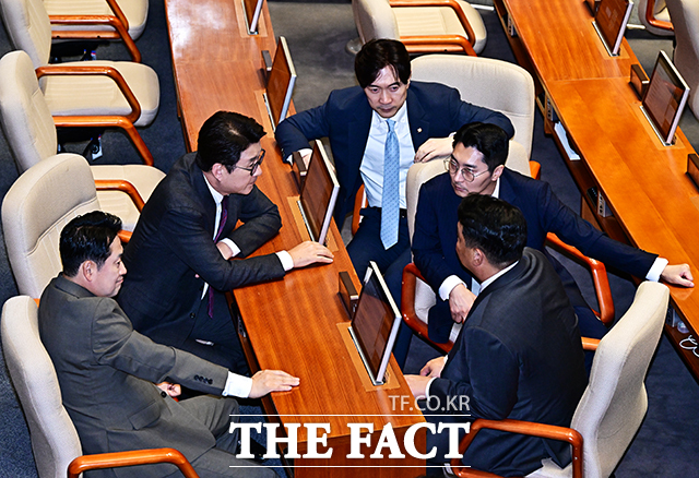 [더팩트ㅣ국회=배정한 기자] 장동혁 국민의힘 대표(왼쪽)와 의원들이 16일 오후 서울 여의도 국회에서 열린 외교·통일·안보에 관한 대정부 질문에 참석해 대화를 하고 있다.