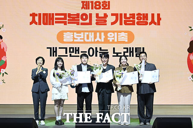 [더팩트ㅣ장윤석 기자] 이스란 보건복지부 제1차관과 코미디언 나현영, 윤승현, 송필근, 박은영, 정범균(왼쪽부터)이 16일 오후 서울 강남구 과학기술컨벤션센터에서 열린 '제18회 치매극복의 날 기념식'에서 기념 촬영을 하고 있다.