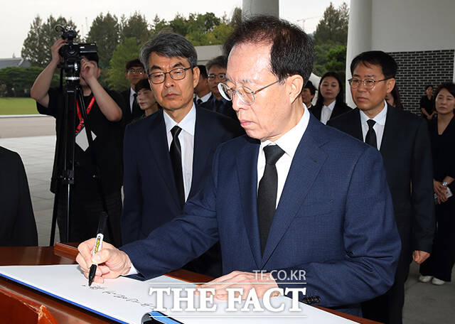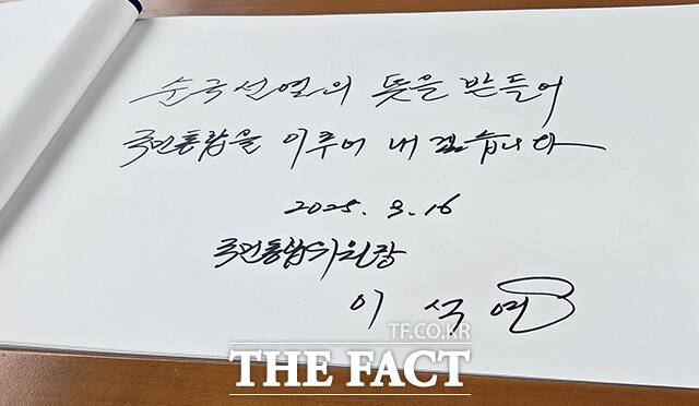 이 위원장은 이날 국민통합위원회 직원들과 함께 현충원 참배를 마친 뒤 방명록에 "순국선열의 헌신을 기리며, 국민통합을 이루어 내겠습니다"라고 남겼다.