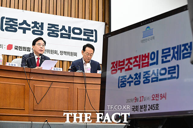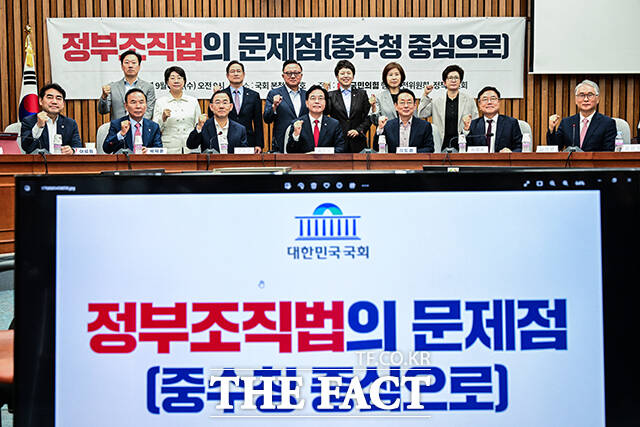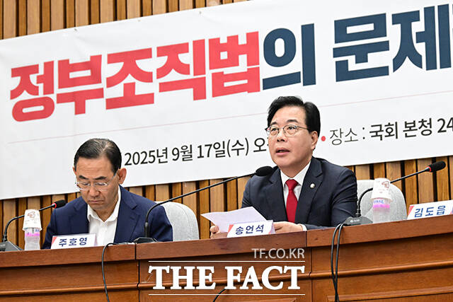 [더팩트ㅣ국회=남윤호 기자] 송언석 국민의힘 원내대표가 17일 오전 서울 여의도 국회에서 열린 '정부조직법의 문제점(중수청 중심으로)' 토론회에 참석해 축사하고 있다.