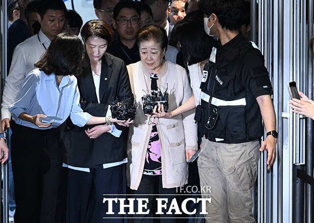 [더팩트ㅣ박헌우 기자] 한학자 세계평화통일가정연합(통일교) 총재가 17일 오전 서울 종로구 KT광화문빌딩 웨스트에 마련된 김건희특검 사무실에 출석하고 있다.