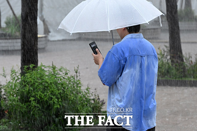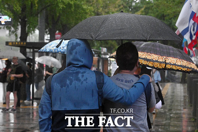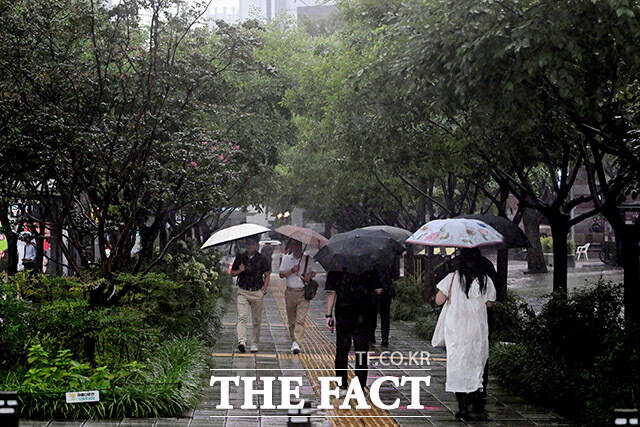 [더팩트ㅣ남용희 기자] 동남권을 제외한 서울 전역에 호의주의보가 내려진 17일 오전 서울 종로구 광화문 네거리 일대에서 시민들이 우산을 쓴 채 발걸음을 재촉하고 있다.