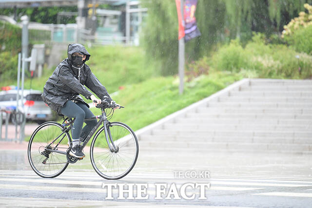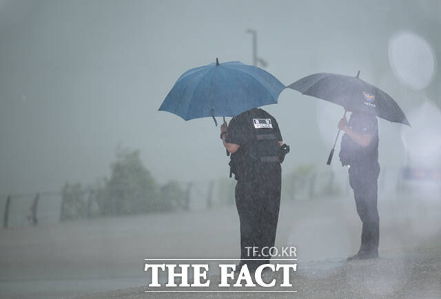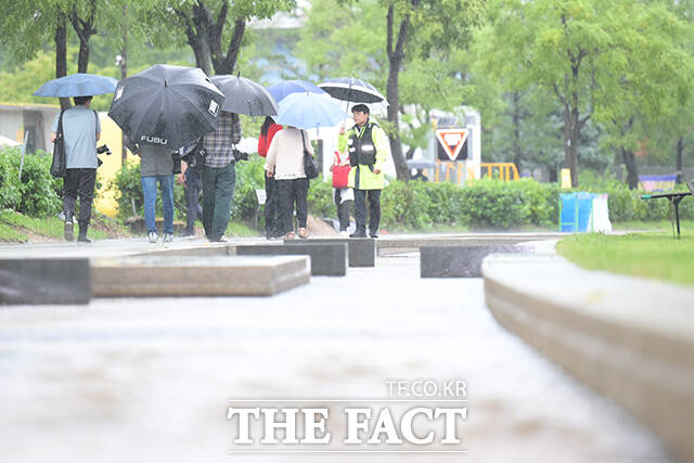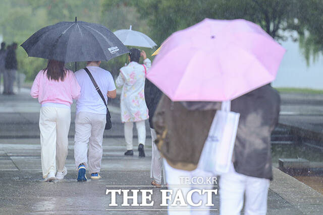 [더팩트ㅣ장윤석 기자] 기습 폭우가 쏟아진 17일 오전 서울 여의도 한강공원에서 우산을 쓴 시민들이 발걸음을 재촉하고 있다.