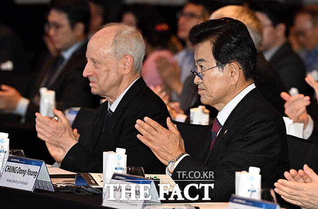 [더팩트ㅣ임영무 기자] 정동영 통일부 장관(오른쪽)과 마이클 샌델 하버드대 교수가 18일 오전 서울 종로구 포시즌스 호텔 서울에서 열린 2025 국제 한반도 포럼(GKF)에 참석해 박수를 치고 있다.darkroom@tf.co.kr사진영상기획부 photo@tf.co.kr