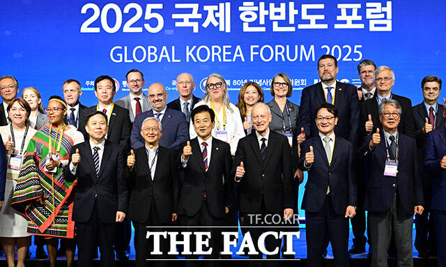 [더팩트ㅣ임영무 기자] 정동영 통일부 장관(오른쪽 네 번째)과 마이클 샌델 하버드대 교수 등 참석자들이 18일 오전 서울 중구 포시즌스 호텔 서울에서 열린 2025 국제 한반도 포럼(GKF)에 참석해 기념 촬영을 하고 있다.