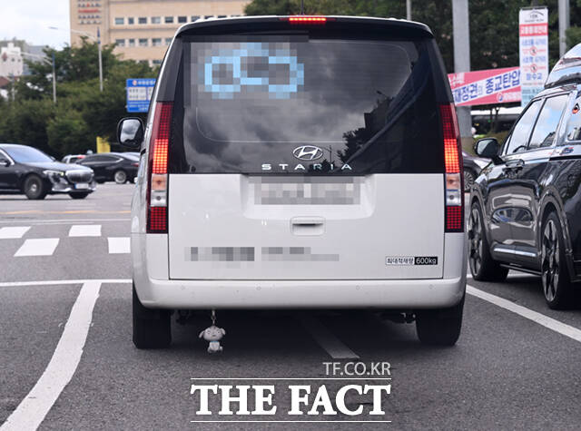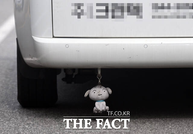 18일 서울 서초구 일대의 도로에서 한 승합차량 후미 하단에 대롱대롱 매달려 도로를 위를 아슬아슬 주행하는 흰 강아지 인형 키링이 눈길을 끕니다.