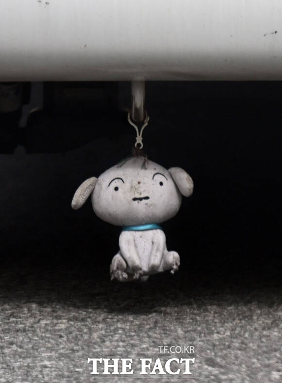 일본의 유명 애니메이션 캐릭터 짱구의 반려견 흰둥이로 보이는 해당 인형은 당초 이름 만큼이나 희고 귀여운 얼굴이었을테지만, 도로 위를 달리는 지금은 얼굴과 몸통, 다리 등 군데군데 먼지와 검은 때를 뒤집어 쓴 모습입니다.