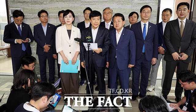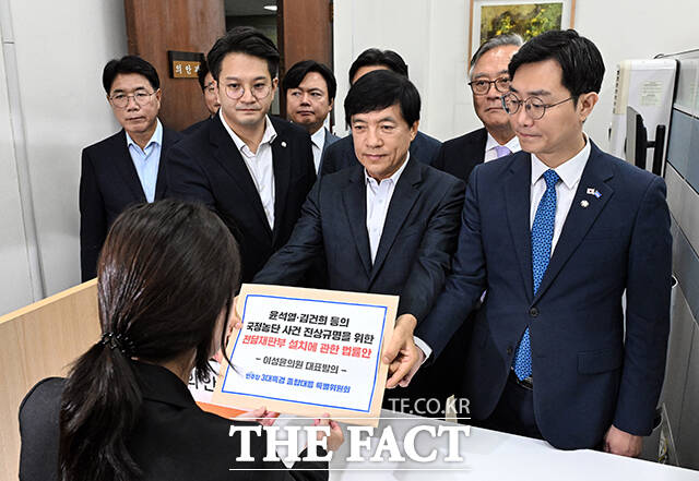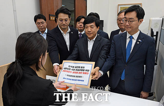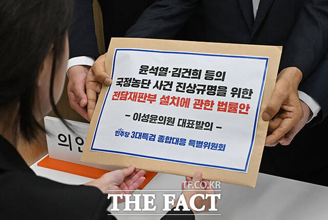 [더팩트ㅣ국회=남윤호 기자] 더불어민주당 3대특검 종합대응 특별위원회 이성윤 의원 등이 18일 국회 의안과에 '윤석열·김건희 등의 국정농단 사건 진상규명을 위한 전담재판부 설치에 관한 법률안'을 제출하고 있다.