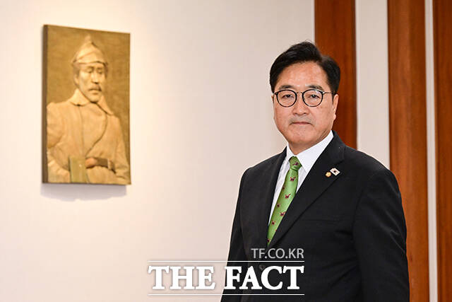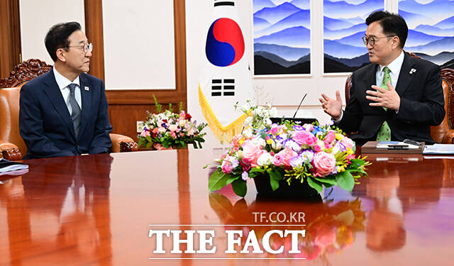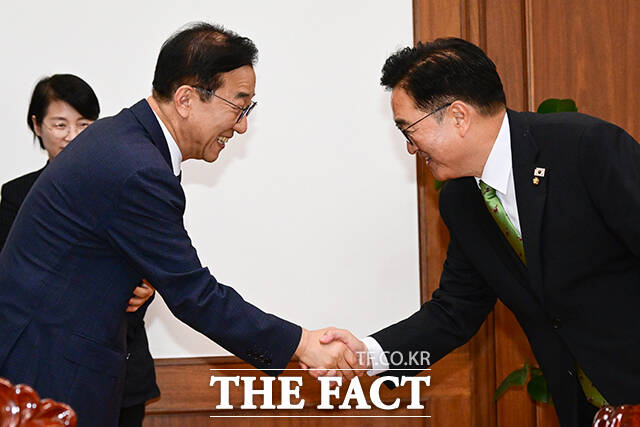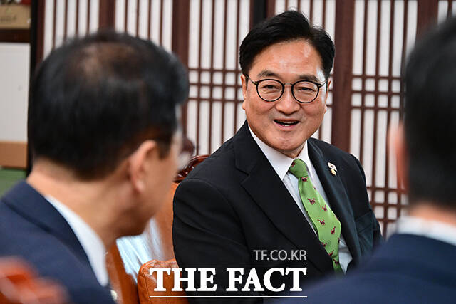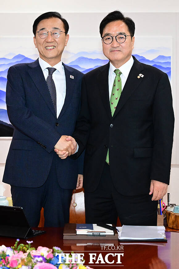 [더팩트ㅣ국회=남윤호 기자] 우원식 국회의장이 18일 오후 서울 여의도 국회에서 김윤덕 국토교통부 장관을 만나 기념촬영을 하고 있다.