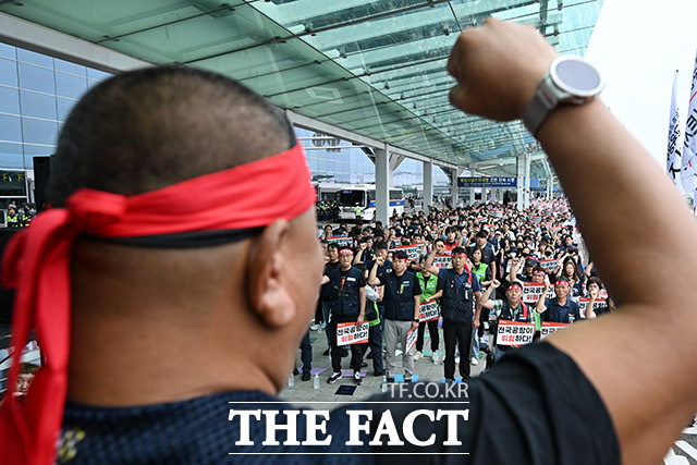 [더팩트ㅣ인천국제공항=남용희 기자] '전국공항노동자 총파업 대회'가 19일 오전 인천국제공항 제2터미널에서 열린 가운데 참가자들이 구호를 외치고 있다.