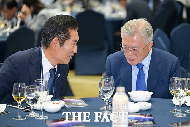 [더팩트ㅣ파주=장윤석 기자] 문재인 전 대통령(오른쪽)이 19일 오전 경기도 파주시 캠프 그리브스에서 열린 9.19 평양공동선언 7주년 기념식에 참석해 정청래 더불어민주당 대표와 대화를 나누고 있다.