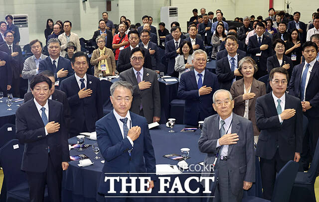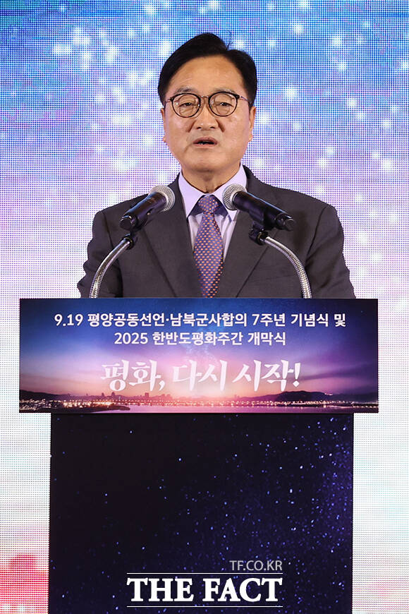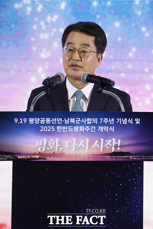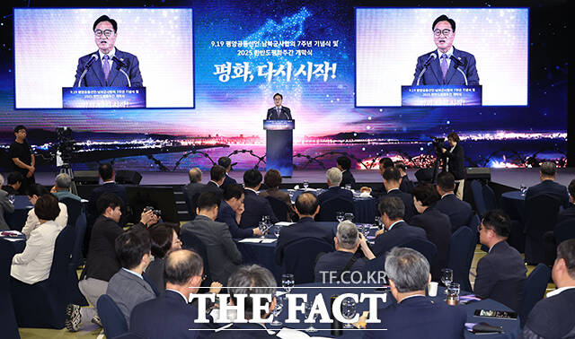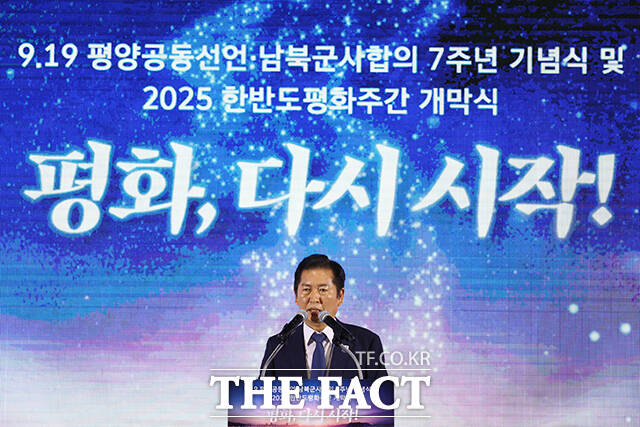 [더팩트ㅣ국회사진기자단] 정청래 더불어민주당 대표가 19일 경기도 파주 캠프 그리브스에서 열린 9.19 평양공동선언 남북군사합의 7주년 기념식 및 2025 한반도 평화주간 개막식에서 축사를 하고 있다.