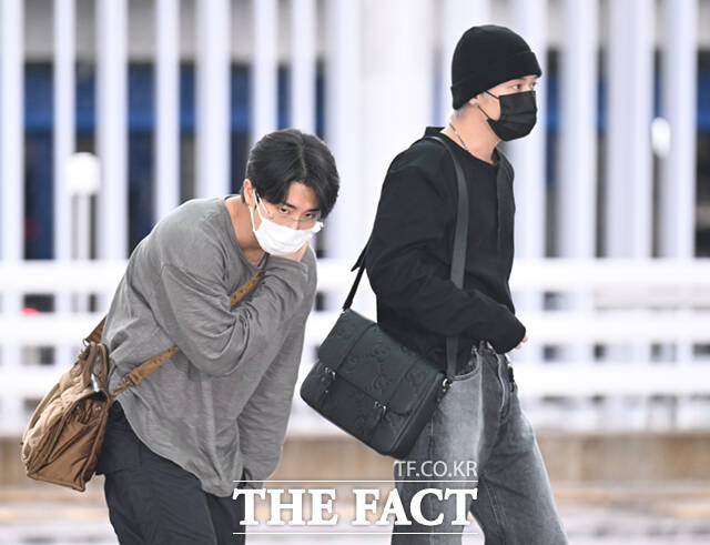 그룹 스트레이 키즈(Stray Kids·스키즈) 창빈(왼쪽)과 방찬(오른쪽 두 번째)이 ‘2025 더팩트 뮤직 어워즈(TMA)’ 참석을 위해 19일 인천국제공항을 통해 출국하며 인사로 장난을 치고 있다.