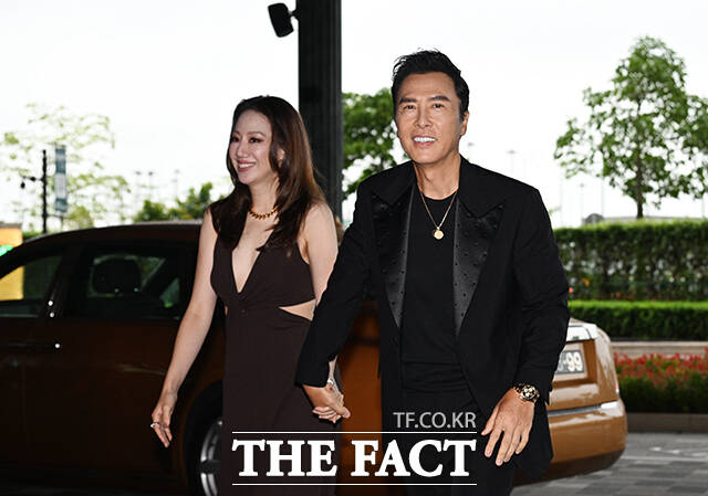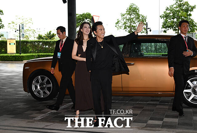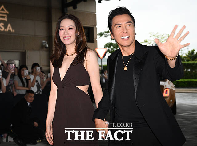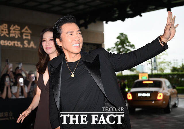 [더팩트ㅣ마카오=박헌우 기자] <더팩트>가 주최하고 팬앤스타와 더스퀘어이엔엠이 주관하는 '2025 더팩트 뮤직 어워즈(THE FACT MUSIC AWARDS, TMA)'가 20일 오후 '마카오 아웃도어 퍼포먼스 베뉴'에서 열린 가운데 세계적인 액션배우 겸 감독 견자단(오른쪽)과 아내 씨실리아 웡(Cecilia wang)이 손을 흔들고 있다.