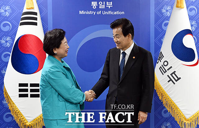 [더팩트ㅣ임영무 기자] 정동영 통일부 장관(오른쪽)이 22일 오후 서울 종로구 정부서울청사에서 현정은 현대그룹 회장과 면담을 앞두고 악수를 나누고 있다.darkroom@tf.co.kr사진영상기획부 photo@tf.co.kr