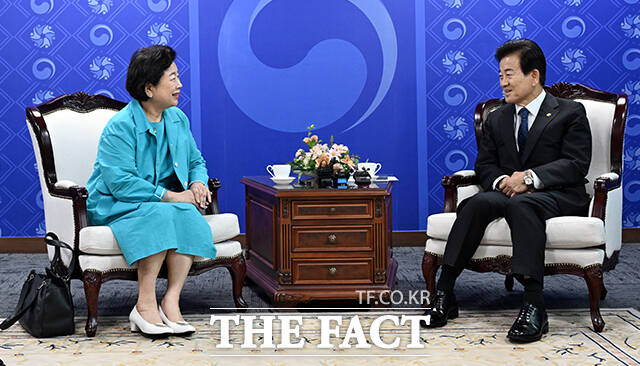 [더팩트ㅣ임영무 기자] 정동영 통일부 장관(오른쪽)이 22일 오후 서울 종로구 정부서울청사에서 현정은 현대그룹 회장과 면담을 갖고 있다.darkroom@tf.co.kr사진영상기획부 photo@tf.co.kr