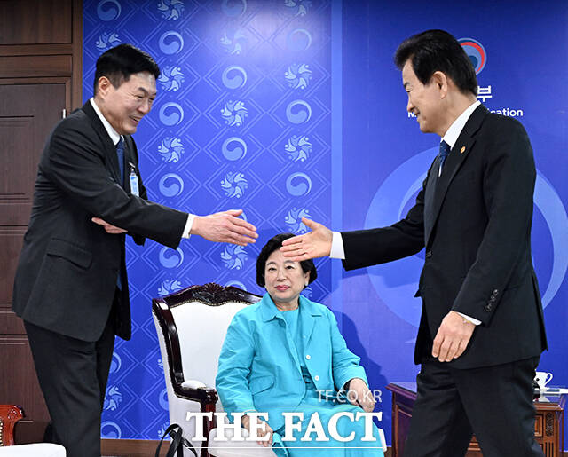 [더팩트ㅣ임영무 기자] 정동영 통일부 장관(오른쪽)이 22일 오후 서울 종로구 정부서울청사에서 현정은 현대그룹 회장과 함께 장관실을 찾은 이백훈 현대아산 대표와 인사를 나누고 있다. darkroom@tf.co.kr사진영상기획부 photo@tf.co.kr