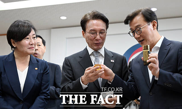 [더팩트ㅣ임영무 기자] 김민석 국무총리(가운데)가 23일 오전 서울 종로구 정부서울청사에서 열린 추석 명절 맞이 농수산식품 소비촉진 행사에 참석해 전재수 해양수산부 장관으로부터 수산물 제품의 설명을 듣고 있다.