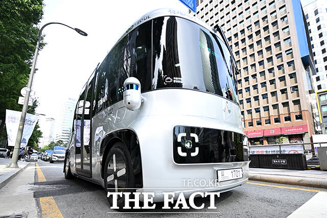 [더팩트ㅣ서예원 기자] 운전석 없는 자율주행셔틀 '청계A01'이 23일 오전 서울 종로구 청계천 일대에서 시험운행을 하고 있다.