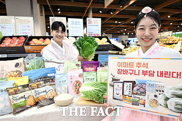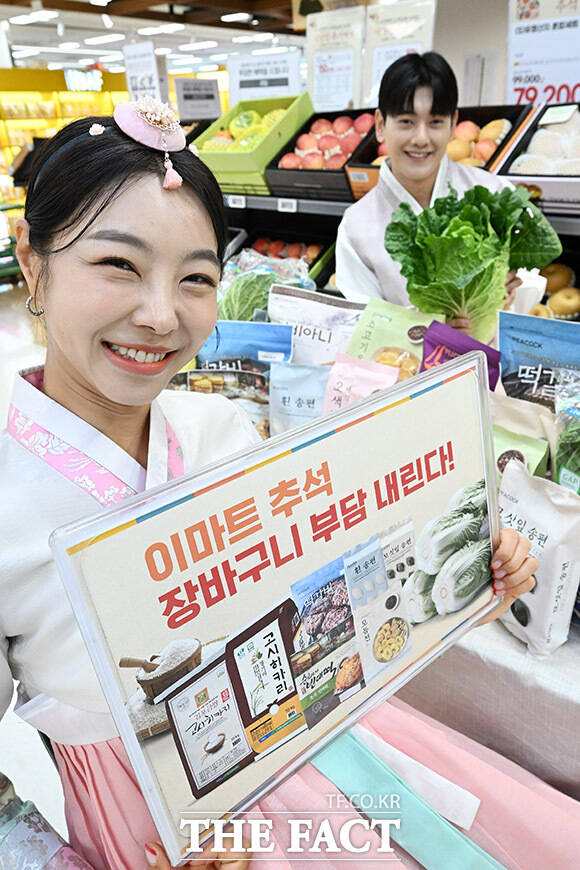 [더팩트ㅣ남용희 기자] 이마트가 명절 물가 안정을 위한 할인 행사를 진행한다고 밝힌 23일 오전 서울 용산구 이마트 용산점에서 모델들이 행사 상품을 선보이고 있다.