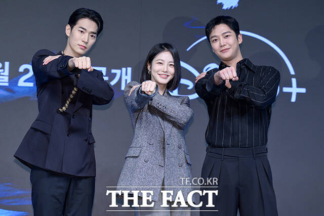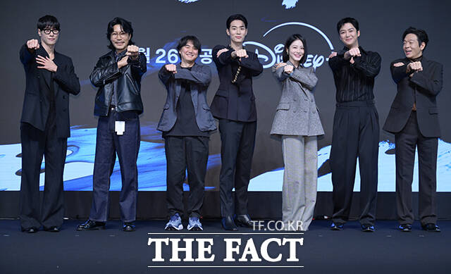 [더팩트ㅣ장윤석 기자] 배우 김동원과 최귀화, 추창민 감독, 배우 박서함, 신예은, 로운, 박지환(왼쪽부터)이 23일 오전 서울 강남구 엘리에나 호텔에서 열린 디즈니+ 새 오리지널 시리즈 '탁류' 제작발표회에 참석해 포즈를 취하고 있다.