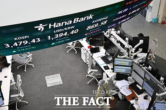 코스피가 사상 최고치를 재차 경신하고 있는 23일 오후 서울 중구 하나은행 본점 딜링룸 전광판에 코스피 지수가 나타나고 있다. /서예원 기자